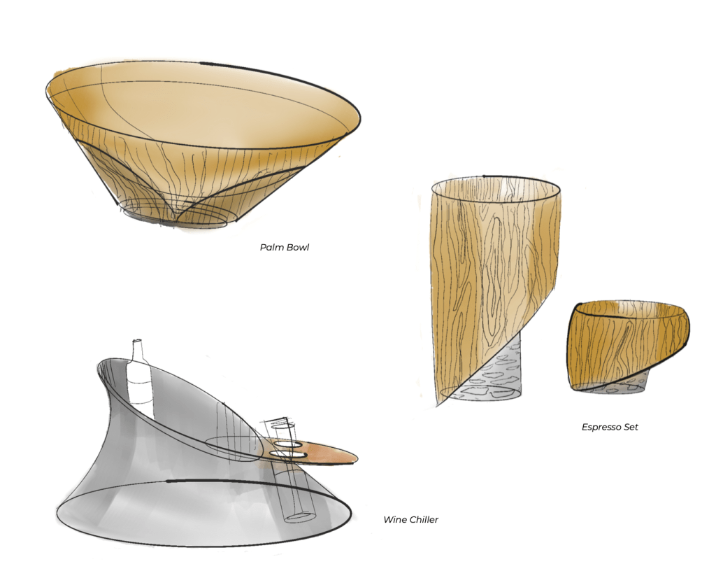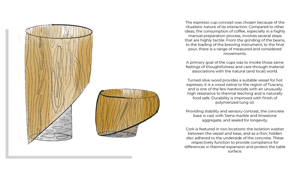 To the right is an espresso set. Both a smaller and a larger size are depicted to show the variable form language. Coffee immediately stood out as an option because many people already have an established ritual around it. So, running with the theme of the other two, the coffee cups create intimacy with the morning ritual. A weighty concrete base and wooden vessel provide support down low and a comfortable grip up top.