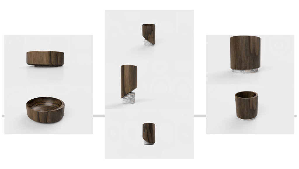 Below, a few of my favorite form iterations are showcased. To the left, a bowl concept. It’s inspired by the Palm Bowl and would have a much wider grip, though it may be a bit heavy to easily lift. The middle example is a skinnier version with some exaggerated height changes. To the right, there’s more of a cocktail-style cup, or maybe a handle-less mug? That focused on a wide base with a very small reveal, and a subtle sweep on the bottom edge of the wood.