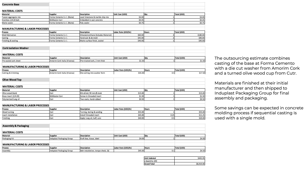 With a good handle on the production, an estimate was created for an order of 20 cups. There is a mix of local and outsourced labor. For the assignment, I used CUTR to handle the wood turning via CNC, while the concrete base is cast with local labor and materials. All materials are sourced in Italy.