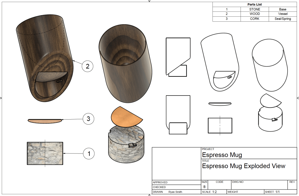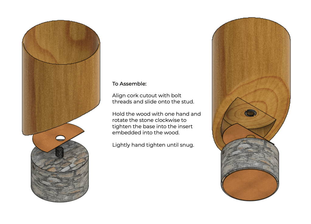 I fleshed out the design in Fusion a bit more, thinking about ways to join the materials while allowing for easy assembly. One idea I liked was the idea of a twist lock. The plan was to use cork as a spring between the stone and the wood, cut tabs into the wood, and cast channels into the concrete. See the image below for an exploded view.