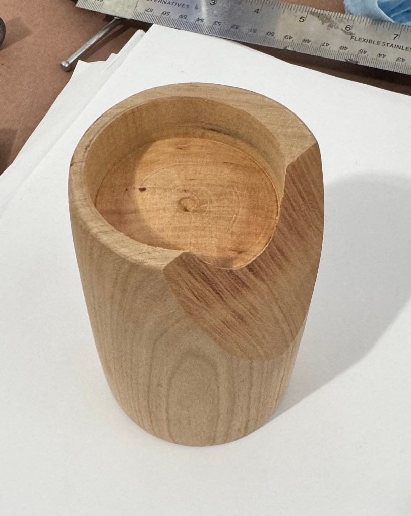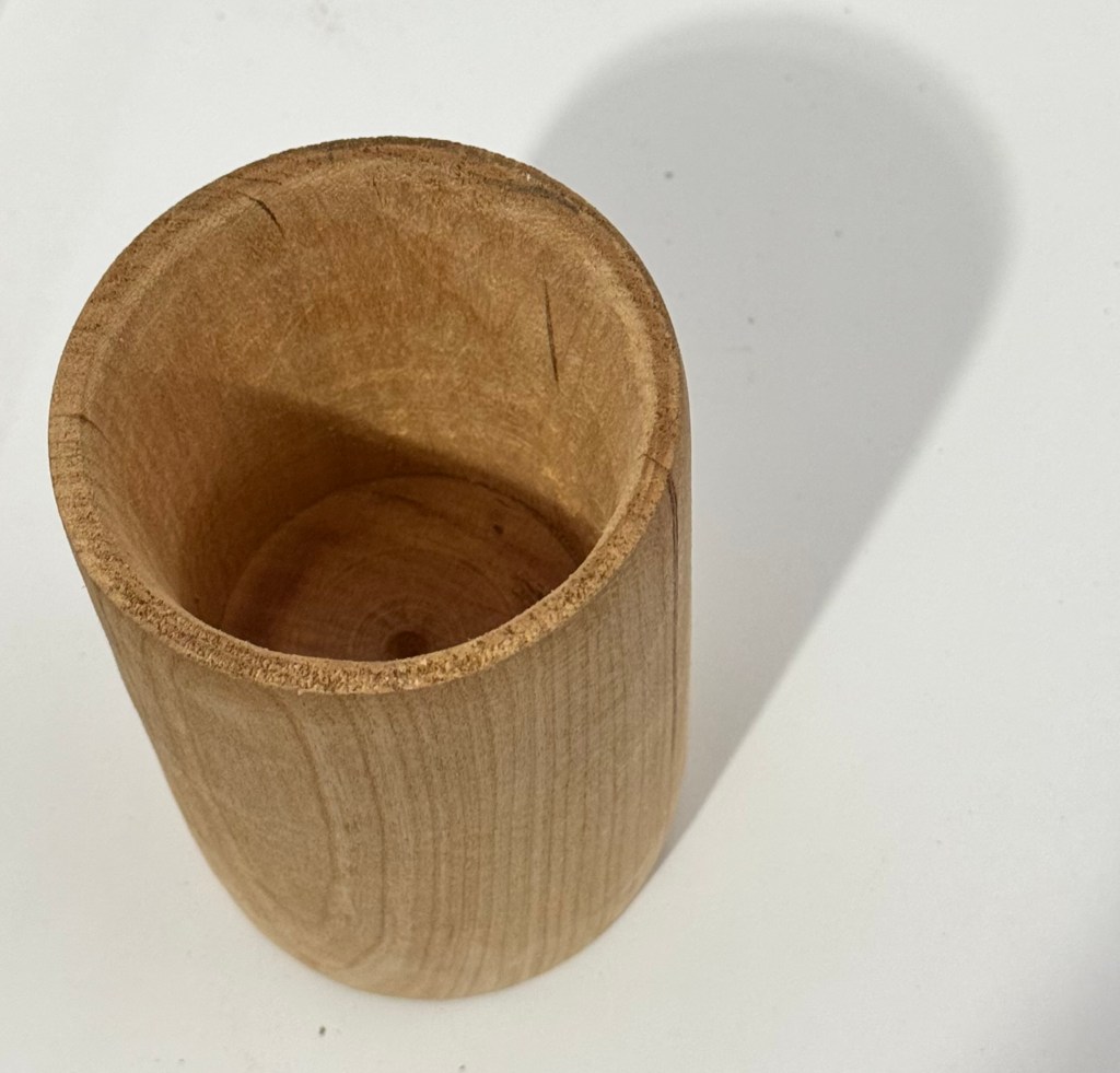 After the cup was test fit together, the wood was sanded to 220 and oiled. Cork washers are cut, and one is adhered to the underside of the base. The final cup is pictured below with two different cork washers.