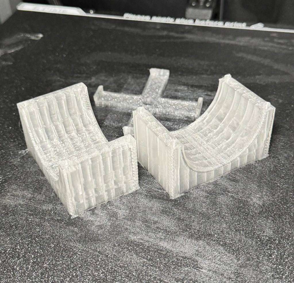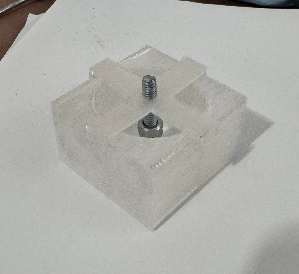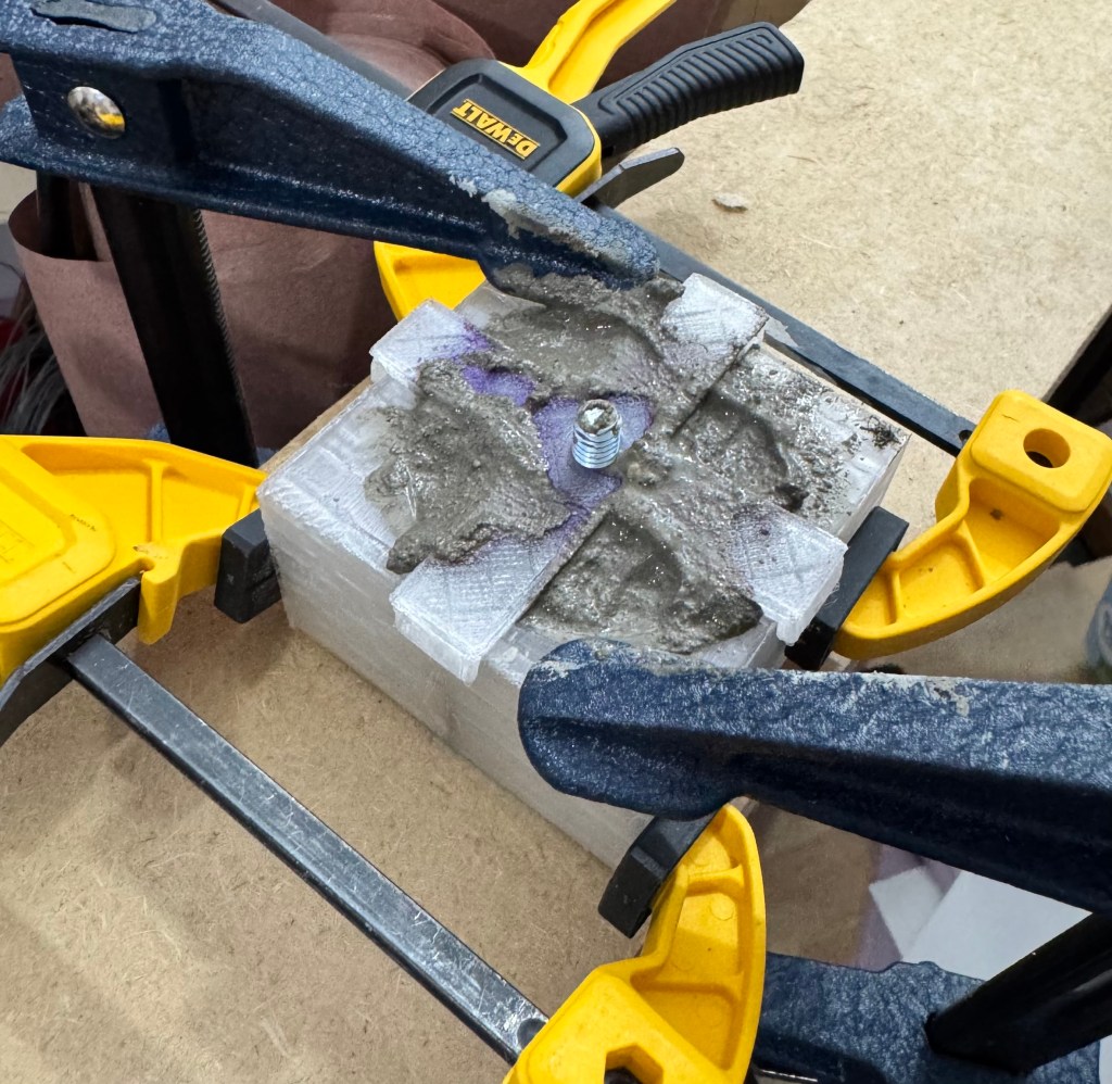 I 3D printed a prototype TPU mold for the concrete casting test. The TPU was too stiff to release properly from the concrete in one piece, so the mold failed (it will be pictured shortly). After that, I created a two-part mold out of PLA. That did release from the mold, but the mix, at the correct aggregate size, did not retain sufficient detail to interact with locking tabs in a meaningful way. The trial led to a redesign. I thought of a cast-in-place solution, using a bolt to prototype, and a threaded insert in the wood – see drawing below.